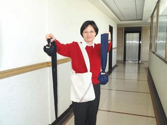 陳姝希說,「悠樂袋」的帶子與球間以鈕扣銜接,帶子縮短時,也可當(dāng)作按摩棒,解開鈕扣后,帶子跟球體就可分開,長帶子可充當(dāng)伸展帶。球體展開后,就是一般的肩背包,外出購物時可當(dāng)購物袋,因為兼具運動及日常生活的便利功能,所以稱之為「悠樂袋」。