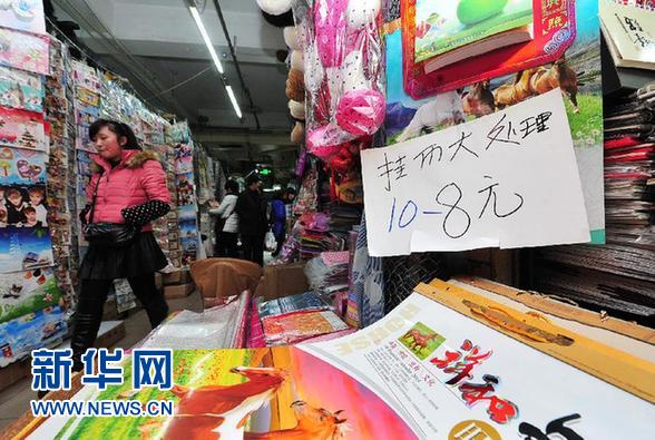 12月18日,銀川市東方商城一家主營臺歷賀卡的商鋪掛出了打折處理的牌子吸引顧客。 “公款賀卡”禁令出臺后,寧夏銀川年歷賀卡市場銷售遇冷,單位、企業(yè)大量購買賀年卡、年歷、明信片的情況今年阿基本消失,顧客以散客為主。銀川市各商城內銷售賀卡年歷的商家生意冷清,部分商家開始降低零售價格。 新華社記者 彭昭之 攝