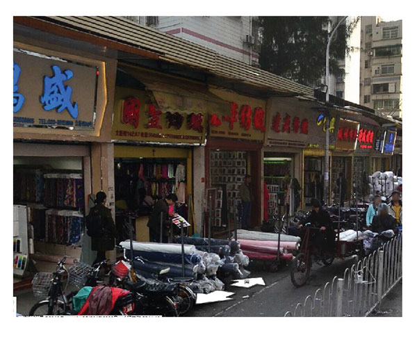 這是風(fēng)衣料,棉衣料,羽絨面料比較集中的一條街;盡色和印花,提花都有。再往前走就有賣牛仔料。