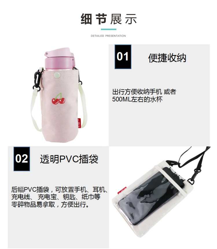 小巧精致的水杯手機包可裝水杯,手機,小物件內(nèi)里增加可耐高溫里布后幅pvc材質(zhì),手機不用取出,可劃屏使用