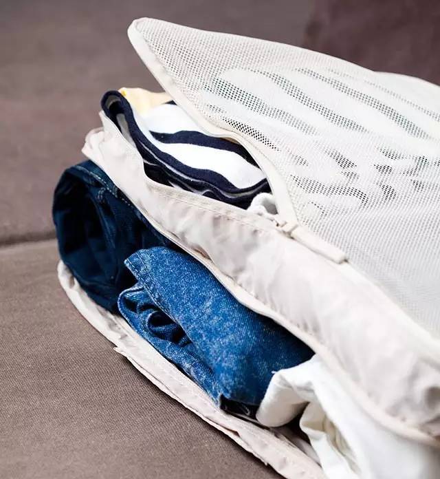 衣物袋是雙層的,可以把褲子和上衣分開裝,一般可以裝2-3條褲子,3-4件T恤。而且,上層是可視型網(wǎng)格設計,方便看清里面的衣物,找起來也方便。