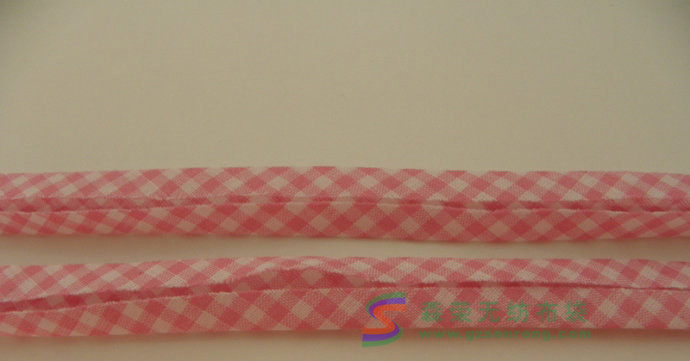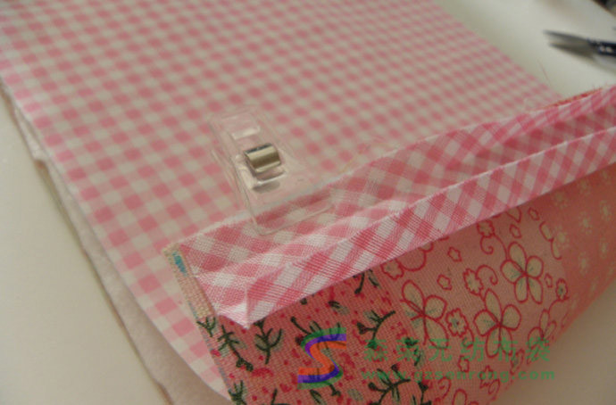 然后將包邊條和表布重合,如圖,然后將包邊條翻過去,背面用藏針縫縫好。