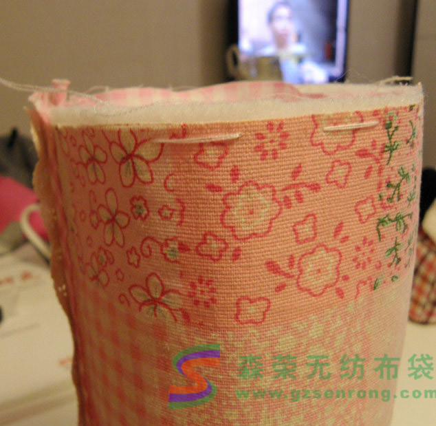 第二步,收緊兩頭做出圓筒狀。這一步看起來(lái)難,其實(shí)非常簡(jiǎn)單。針穿透全部的表里布以及鋪棉,采用平針疏縫,但是間距要大,(如果間距太小拉緊的時(shí)候會(huì)比較吃力),而且間距注意要均勻(包型對(duì)稱漂亮就靠它了),如果不成功可以多試幾次。
