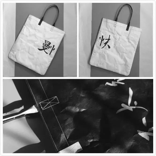 Tyvek? 特殊的紙感讓設(shè)計師聯(lián)想到了文字。為了充分體現(xiàn)漢字的魅力,并呼應(yīng)Tyvek? 的紙質(zhì)特性,所有文字和圖樣均由設(shè)計師手寫并掃描而成,保留了書法墨跡在宣紙上的獨特效果。整個系列的文字內(nèi)容選擇了三組反義詞和三組潛臺詞,兼具嚴肅與詼諧,為不同人群需求提供豐富的選擇。