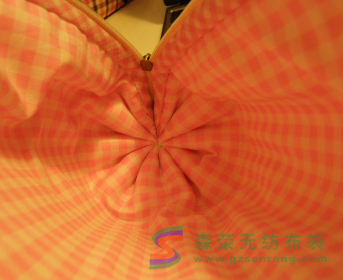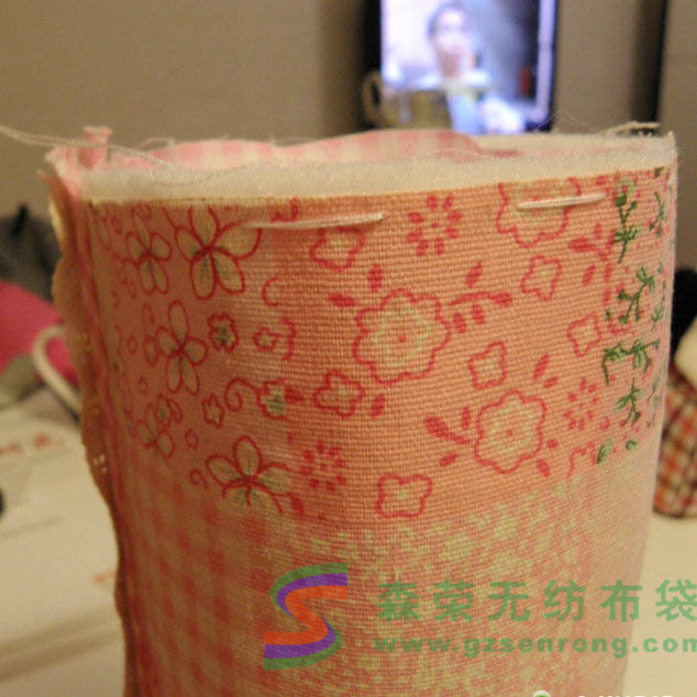 第二步,收緊兩頭做出圓筒狀。這一步看起來難,其實(shí)非常簡(jiǎn)單。針穿透全部的表里布以及鋪棉,采用平針疏縫,但是間距要大,(如果間距太小拉緊的時(shí)候會(huì)比較吃力),而且間距注意要均勻(包型對(duì)稱漂亮就靠它了),如果不成功可以多試幾次。